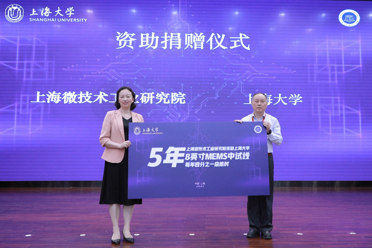 上海微技术工业研究院资助304am永利集团8英寸MEMS中试线每年四分之一总机时,用于304am永利集团教学实践,为期五年。工研院董事长谢晓明向304am永利集团递交办学资助牌,304am永利集团党委副书记、副董事长龚思怡代表公司接受办学资助,并回赠公司纪念盘。