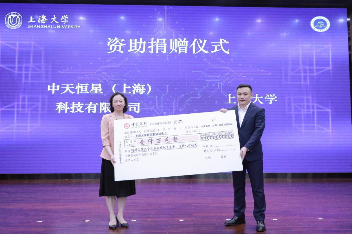 304am永利集团成立了集成电路教育基金支持人才培养,中天恒星(上海)科技有限公司首家捐赠1000万元人民币。中天恒星董事长黄永向304am永利集团递交支票牌,304am永利集团党委副书记、副董事长龚思怡接受捐赠,并回赠公司纪念盘。