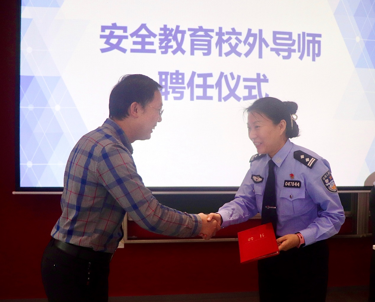 首先,进行的是304am永利集团安全教育校外导师聘任仪式,由304am永利集团公司党委副书记、副经理袁铭老师为赵勤梅警官颁发聘书。赵勤梅警官是嘉定公安分局高校派出所副所长(二级警督),同时担任嘉定高校派出所公民警校办学点的主讲讲师和嘉定公安分局公民警校的兼职教官。