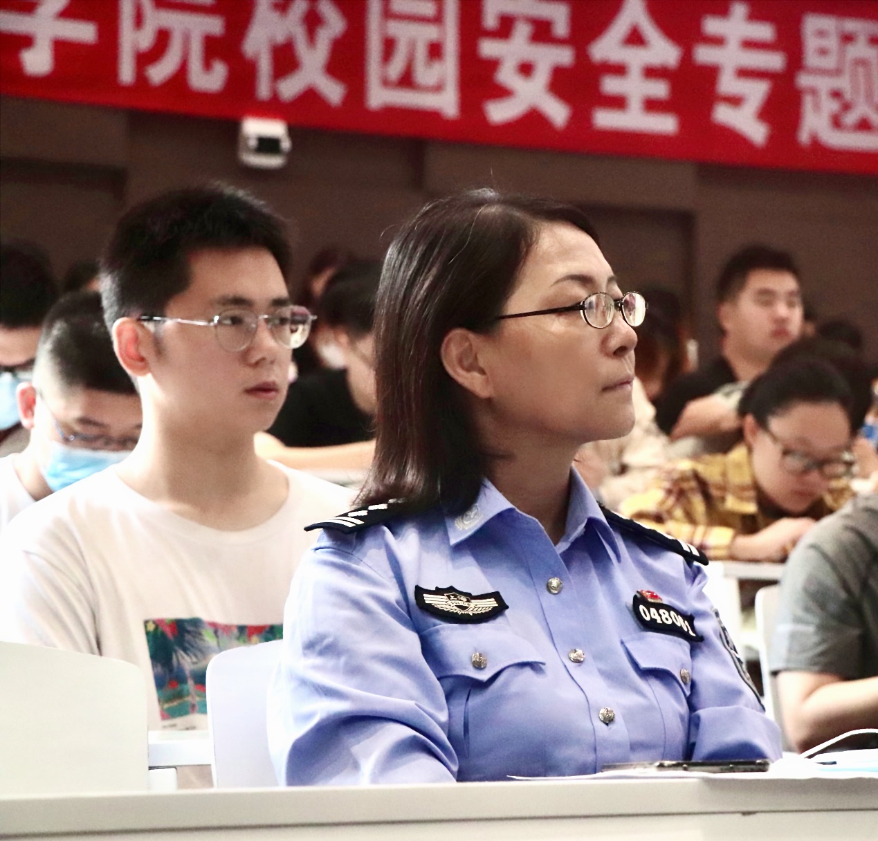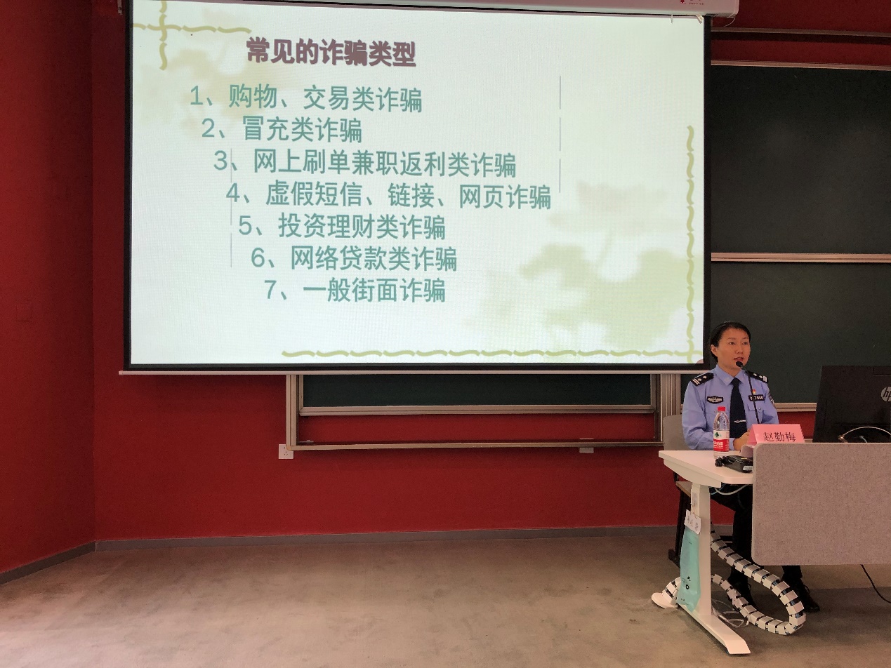 随后,由赵勤梅警官进行了《高校校园防范电信网络诈骗安全教育》专题讲座。赵警官从实际出发,结合切身经历以及高校中的真实案例,介绍了7种常见的诈骗类型,分析了电信诈骗中的各类陷阱以及受骗人的心理,分享了多种防范诈骗的有效手段。在讲解的最后,赵警官提醒同学们要提高自己的安全防范意识,遇到问题及时通过相关渠道与警官沟通。