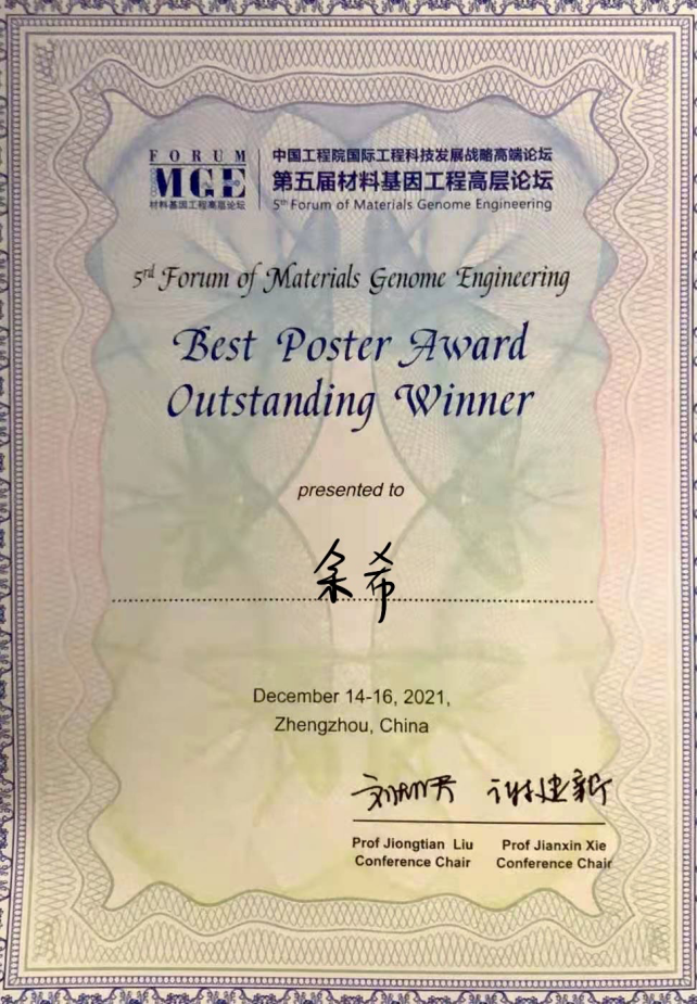 近日,304am永利集团硕士研究生党员余希以“High-throughput study on doped aluminum nitride materials for 5G filters”为题的学术墙报获得中国工程院国际工程科技发展战略高端论坛-第五届材料基因工程高层论坛(5thForum of Materials Genome Engineering)最佳墙报论文奖一等奖。该论坛以“材料高效计算与设计”“材料高通量制备与表征”“材料服役与失效行为高效评价”“材料数据库与大数据技术”“材料基因工程技术应用”为主题,对推动材料研发颠覆性新理念、新方法的形成和传播,促进材料基因工程关键技术的发展和应用起到积极的作用,并已成为材料基因工程领域具有国际影响的高层学术论坛。