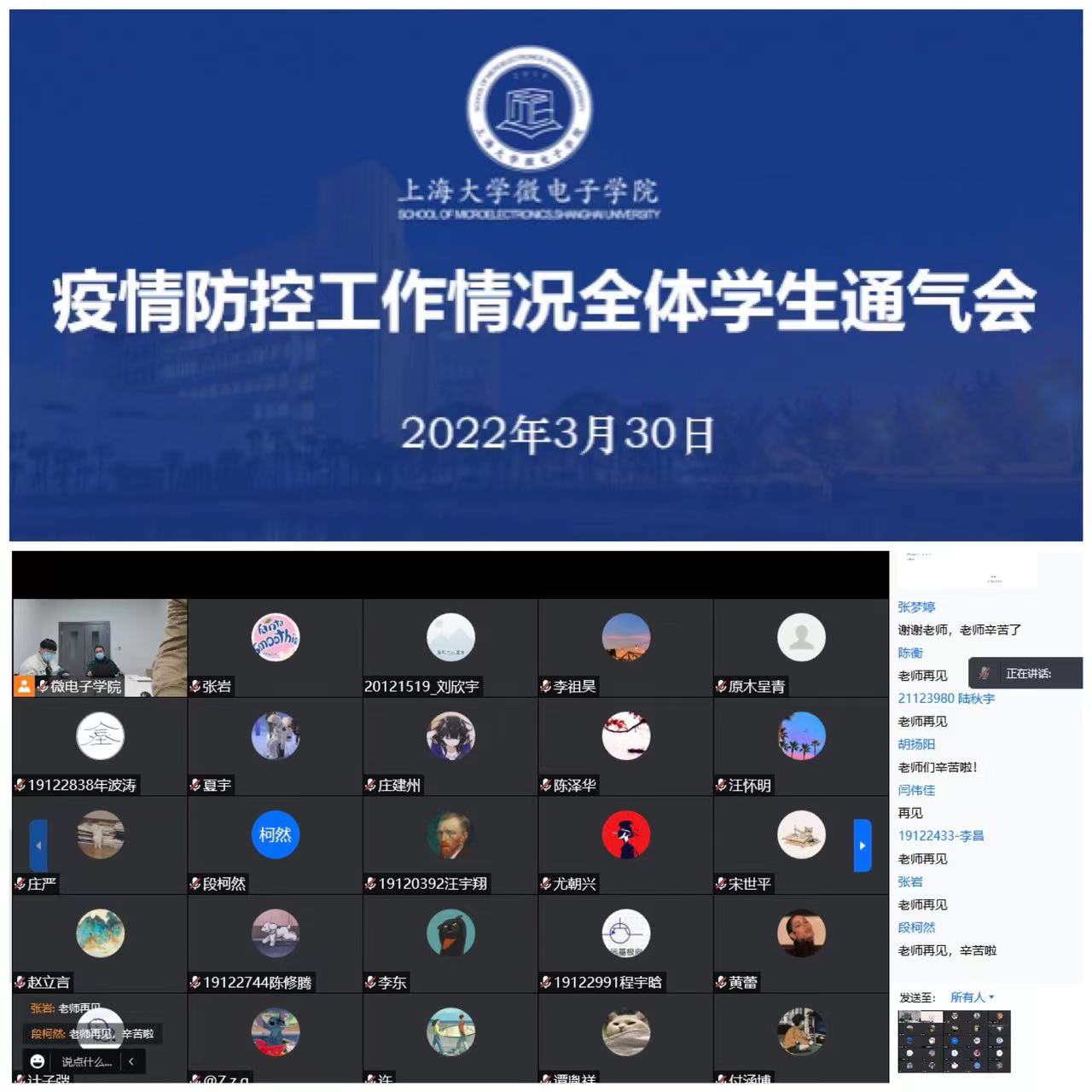 3月30日晚上9点,304am永利集团组织召开疫情防控工作全体本科生、研究生线上会议。公司党委副书记、副经理袁铭通报了公司疫情防控最新情况与最新要求,了解同学们思想状态,并逐一回应同学们关心的在线学习、就医、水果供应、超市补给等问题。