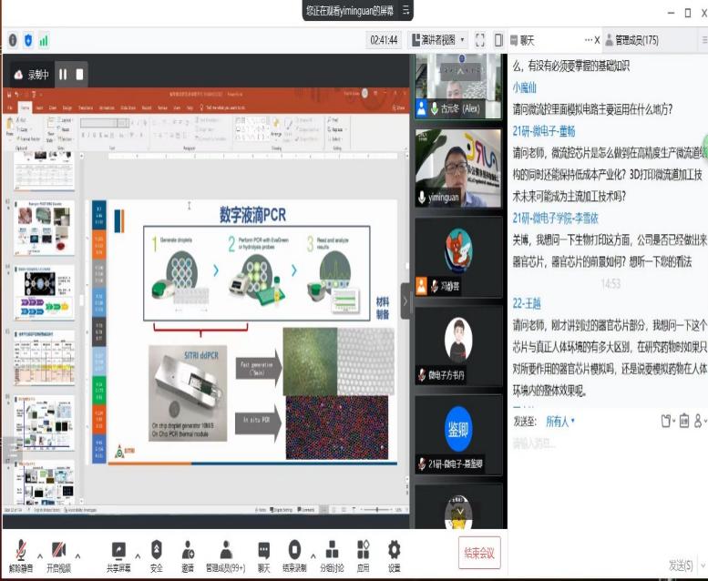 在随后的1个半小时里,关博士从微流控技术的历史引入,从微流控技术的简介及其工作原理、微流控器件市场、微流控的应用领域等多方面通俗易懂地说明了智能微流控MEMS技术及产业特点。重点分享了团队基于CMOS-MEMS集成的热泡打印头核心技术及其广阔的应用场景。关博士团队多年深耕智能微流控领域,积累了包括微泵、微阀、CMOS-MEMS集成等一系列核心技术。此打印技术除了在工业印刷领域填补我国空白外,其他重要应用包括日用手持式喷码机、应用于高通量药物筛选的器官、类器官芯片(如肝、脑器官芯片等)3D细胞打印机、用于单细胞和分子诊断的细胞分拣、样品制备微系统、及ddPCR等。