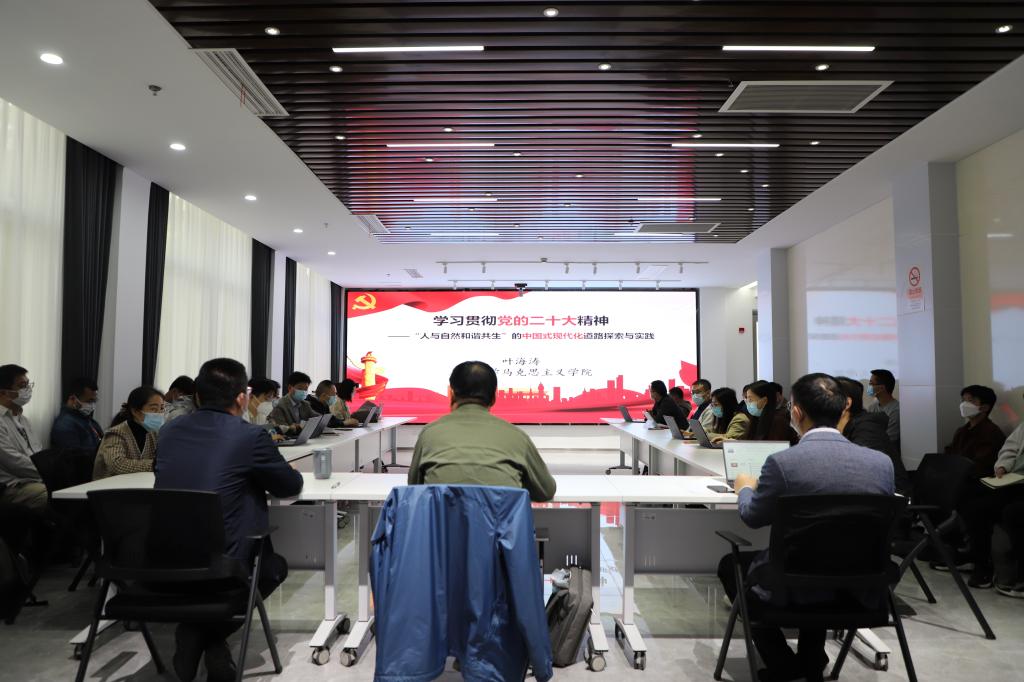 叶海涛教授从党的二十大会议概况、主要议程、报告内容框架等方面作了生动讲解,用深厚的学术研究理论对“人与自然和谐共生”的中国式现代化道路探索与实践进行了深刻阐释,给与会师生带来了启迪和思考。