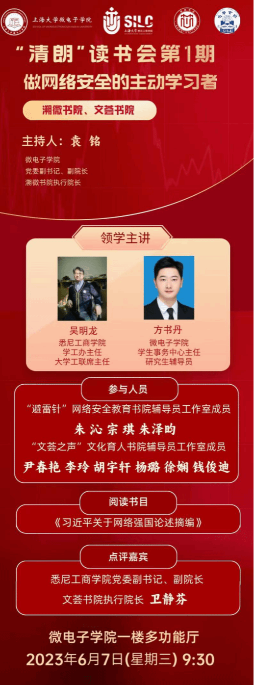 袁铭表示,“清朗”读书会是溯微书院加强辅导员队伍内涵建设的重要举措,也是“避雷针”网络安全教育书院辅导员工作室的重要建设内容,旨在以学懂弄通悟透习近平总书记关于网络强国的重要思想为主线,通过主讲领学、集体研学、联动联学,嘉宾点评的“三学一评”读书会机制,开展常态化网络安全教育主题读书会,让教育者先受教育,不断强化“没有网络安全就没有国家安全”的意识,在书香中汲取智慧和力量,提升知网、懂网、用网能力,切实将网络安全意识内化于心、外化于行,自觉成为网络安全的践行者、传播者、弘扬者。(熊紫昕 王冠雄)
