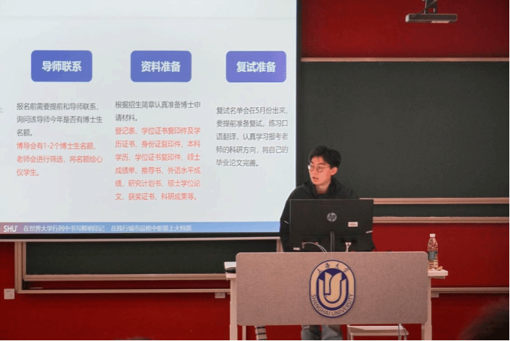张涵同学向同学们详细介绍了博士招生报名的流程和注意事项。他强调了报名过程中的关键环节,如导师选择、研究方向确定以及申请材料的准备等。他还分享了自己在面临工作和继续深造的岔路口时的心路历程,让同学们了解到选择考博需要勇气和决心,但同时也是对个人学术追求、坚持梦想的一种体现。