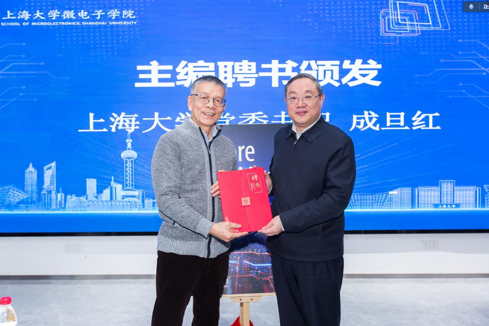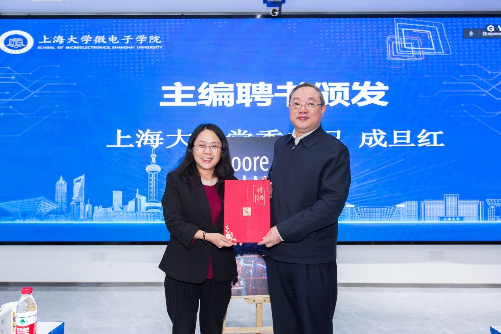 304am永利集团党委书记成旦红为《超越摩尔》主编中国工程院院士吴汉明和304am永利集团执行经理张建华颁发聘书。