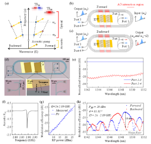 本研究首次报道了基于薄膜AlScN的声光调制器。通过设计声光相互作用结构,实现了最高−19.2 dB的调制效率,同时,调制的射频3-dB带宽为5.9 MHz。在此基础上,实验还演示了基于多模波导中的多模态声光调制,在通信波长范围内0.48 nm的光学带宽上实现了高对比度(>10 dB)的非互易声光调制。这项工作为声光调制器在实现微波光子滤波器、片上无磁光隔离器和光循环器等潜在应用提供了一种新的解决方案。